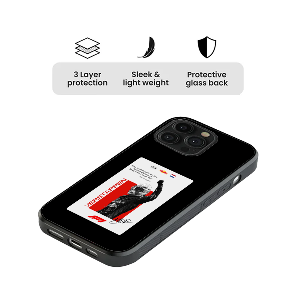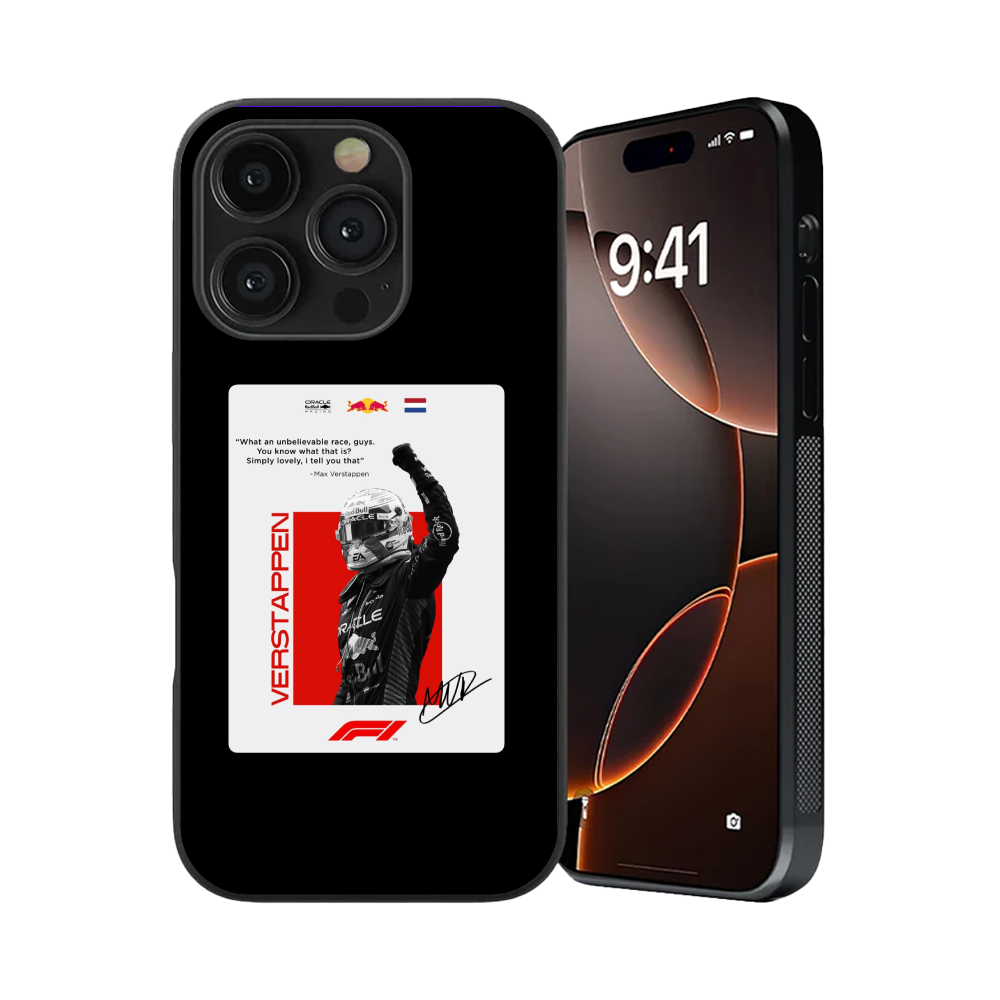This case features an iconic Verstappen celebration framed like a collector’s card, complete with his quote, his colors, and his champion’s aura.